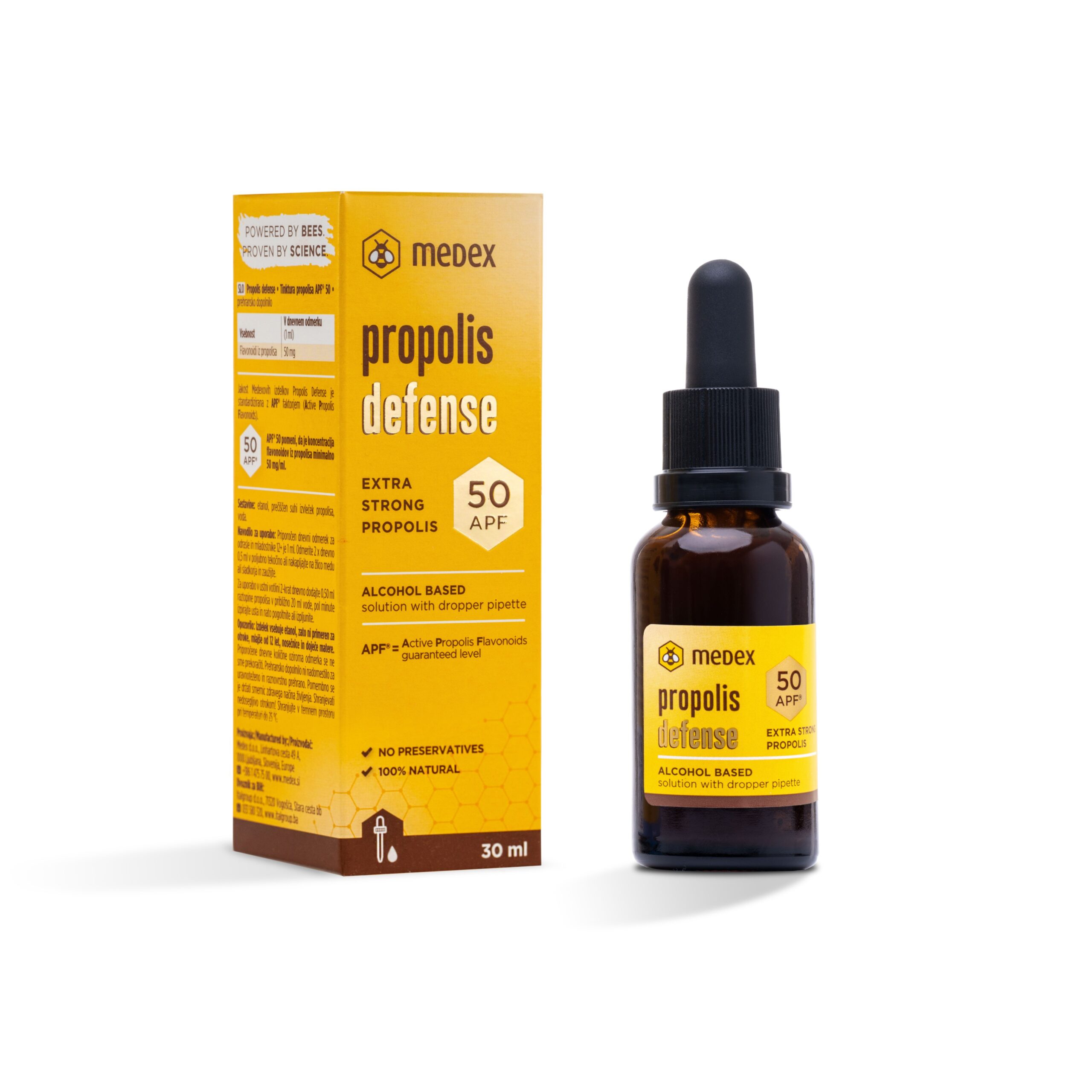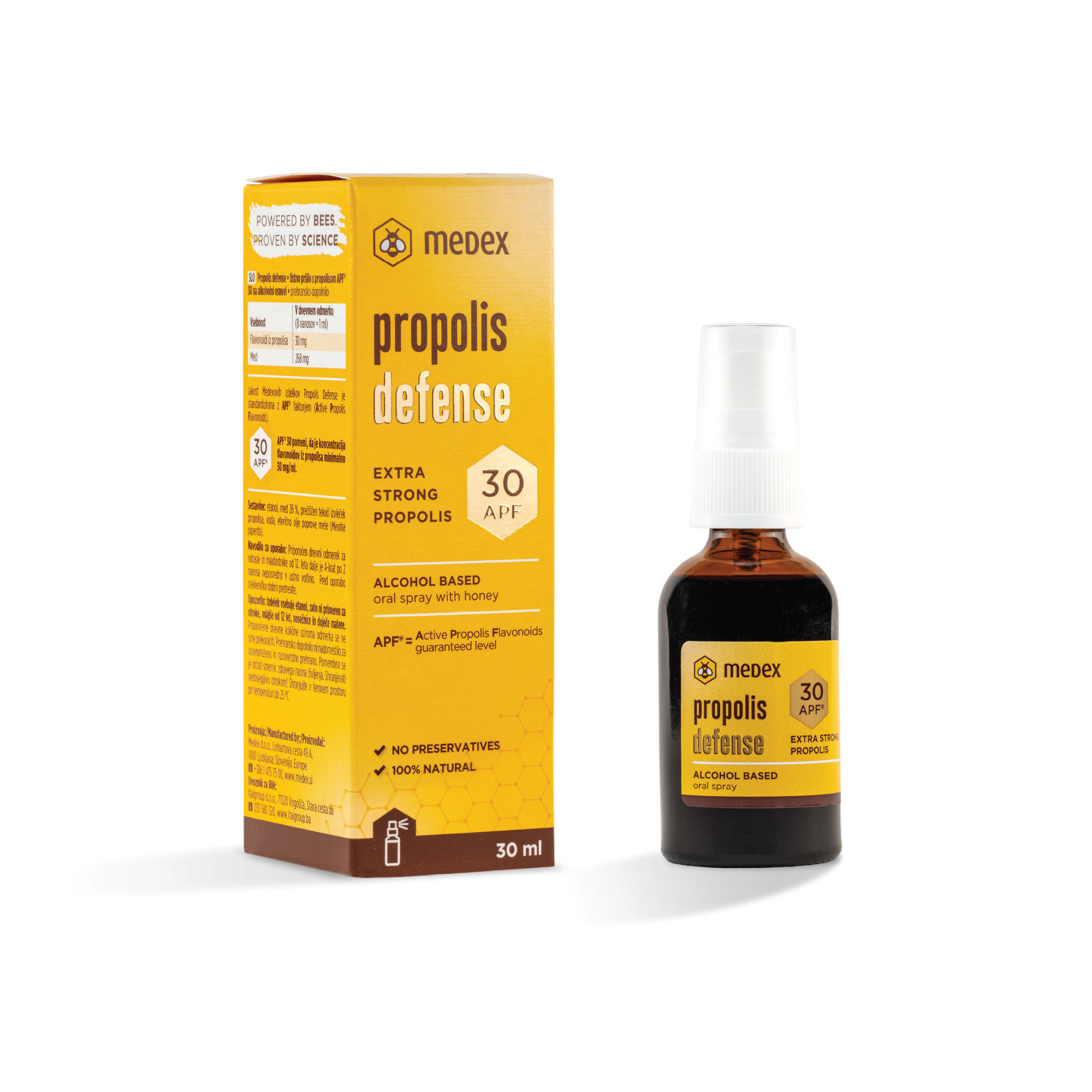 V Medexu smo njegovo moč nadgradili z linijo Propolis Defense, ki vključuje vodne in alkoholne izvlečke z visoko vsebnostjo flavonoidov in klinično potrjeno učinkovitostjo.
